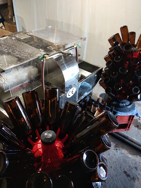 A la brasserie, les bouteilles passent dans un prélavage dans de l’eau chauffée avec du percarbonate de sodium, produit 100% naturel. Puis sur une machine semi automatique avec lavages intérieur et extérieur pour garantir une qualité optimale du verre réutilisé. Environ 200 bouteilles sont récupérées et lavées chaque semaine !